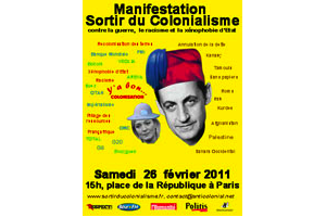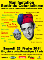 samedi 26 février à 15h : Manifestation pour sortir du colonialisme ! dans le cadre de la 6ème « Semaine anticoloniale » Place de la République à Nation - Il y a 50 ans, les empires coloniaux de l’époque s’effondraient. Patrice Lumumba était assassiné au Congo et des centaines de travailleurs algériens allaient être noyés dans la Seine, jetés par la police française du préfet Papon, parce qu’ils osaient manifester pacifiquement pour l’indépendance de l’Algérie. 50 ans plus tard, un nouvel ordre colonial se réorganise : Les discours colonialistes sur « l’homme africain » et sur les aspects positifs de la colonisation positive, le débat sur l’identité nationale, les campagnes anti immigrés, xénophobes à caractère, raciste, islamophobe et négrophobe, les référendums suisses sur les minarets et la double peine, prépare une guerre de civilisation qui ne dit pas son nom et prend les immigrés et les peuples du sud comme des boucs émissaires de la mondialisation financière et de la crise.