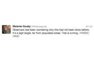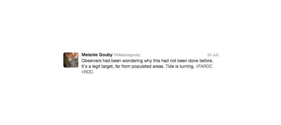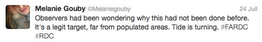 Pourtant pas si loin du camp militaire, ce village où les FARDC ont ciblé les populations civiles… Et l’elliptique allusion à la marée qui tournerait, elle renvoie à l’idée que, contrairement à ce qui a largement été claironné ces derniers temps, le M23 domine toujours la situation sur le terrain. La représentante de la presse parisienne s’empressant un peu vite de voir dans cet effroyable bombardement le début d’une reprise de l’avantage par les FARDC-FDLR, avec lesquels elle sympathise ainsi ouvertement…