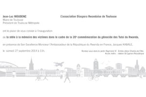 Une stèle en hommage au million de victimes du génocide perpétré contre les Tutsi en 1994 au Rwanda sera inaugurée dans la ville de Toulouse ce samedi 27 septembre 2014, à 11 heures, par Monsieur Jean- Luc Moudenc, Maire de Toulouse, en présence de S.E.M. Jacques Kabale, Ambassadeur de la République du Rwanda en France.